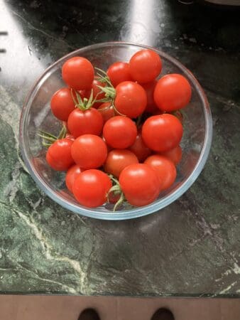 The accidental tomatoes have all suddenly ripened. Mum has been eating little tomatoes from the plant by the greenhouse and the one in amongst the flowers in the front garden. Now the ones that grew amongst the parsnips have all suddenly ripened. Mum and I picked a bowl full, but need to go out and pick another bowl later today. We’ve got family coming for lunch so they will all be sent home with some tomatoes.