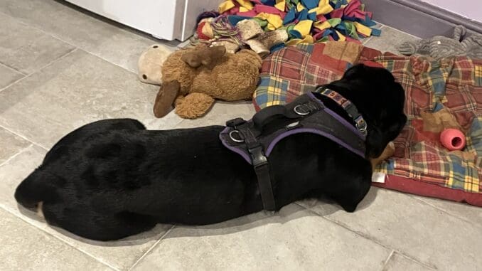 Today Pebbles is back to training for the first time since the holiday. Mum is crossing her fingers that she will get on as well today too. One very important thing has been that Mum has been able to wear some clothes that Pebbles is not familiar with without them being shredded. That is a very big step. Mum doesn’t want to push her luck too far, but it does start to open up the possibility of changing her clothes more often! (Just to reassure you – she does wash them regularly.)