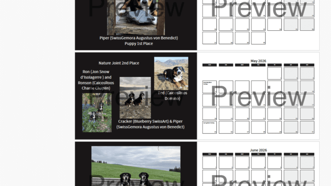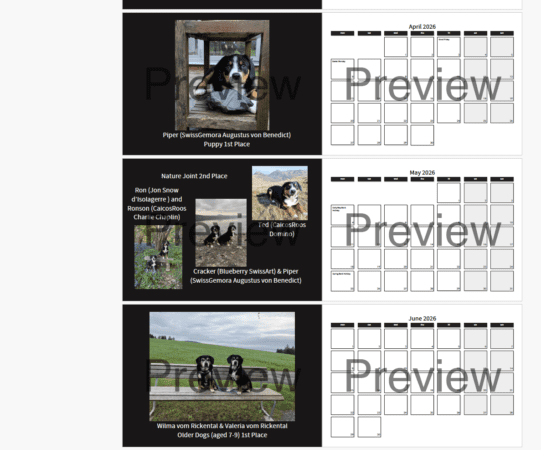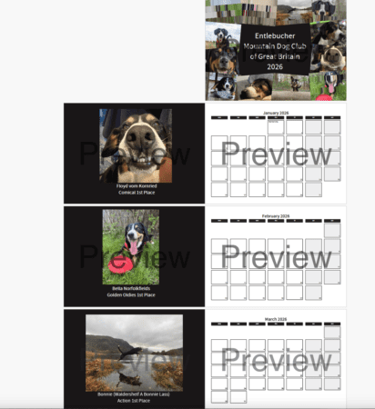 How would you like an Entlebucher Calendar for 2026? I’m ‘Miss June’ with my sister Valeria. Our Club produces a calendar each year to raise money for our Club rescue funds. There are still a few for sale for next year and just enough time to order one in time for Christmas. If you would like to see us on your wall next year the price is £19.50 including UK postage. If you are outside the UK we’d have to work out the cost of sending it to you. Drop me an email at wilma@alfiedog.me.uk and I can sort out the details for you.