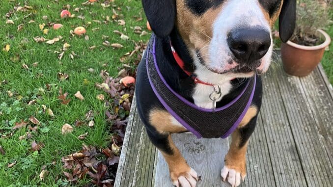 Fortunately Mum was able to hold Pebbles down by her harness to stop her lunging at the vet while he tried to examine her. He didn’t seemed fazed by her, which helped.