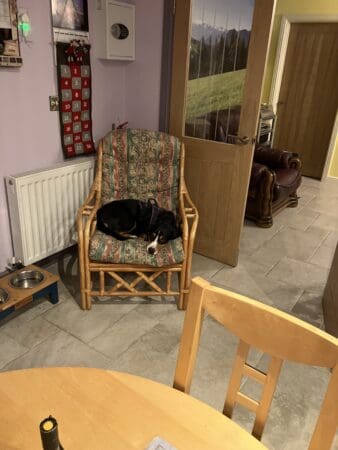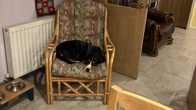 Pebbles has a new favourite chair. There is one particular chair which Granny finds comfortable when she comes. It’s normally in our garden room, but Mum moved it up to a corner of the kitchen for Granny. Dad says he quite likes there being a bit more space in the garden room, so Mum said the chair could stay in the kitchen. Pebbles has promptly adopted it as her own. She’s delighted with her new position of comfort. I’m pleased too as it means my chair in the hall will no longer smell of Pebbles and I can reclaim it as my own. I guess everyone wins… as long as Granny doesn’t mind a few of Pebbles hairs here and there after she’s used the chair.